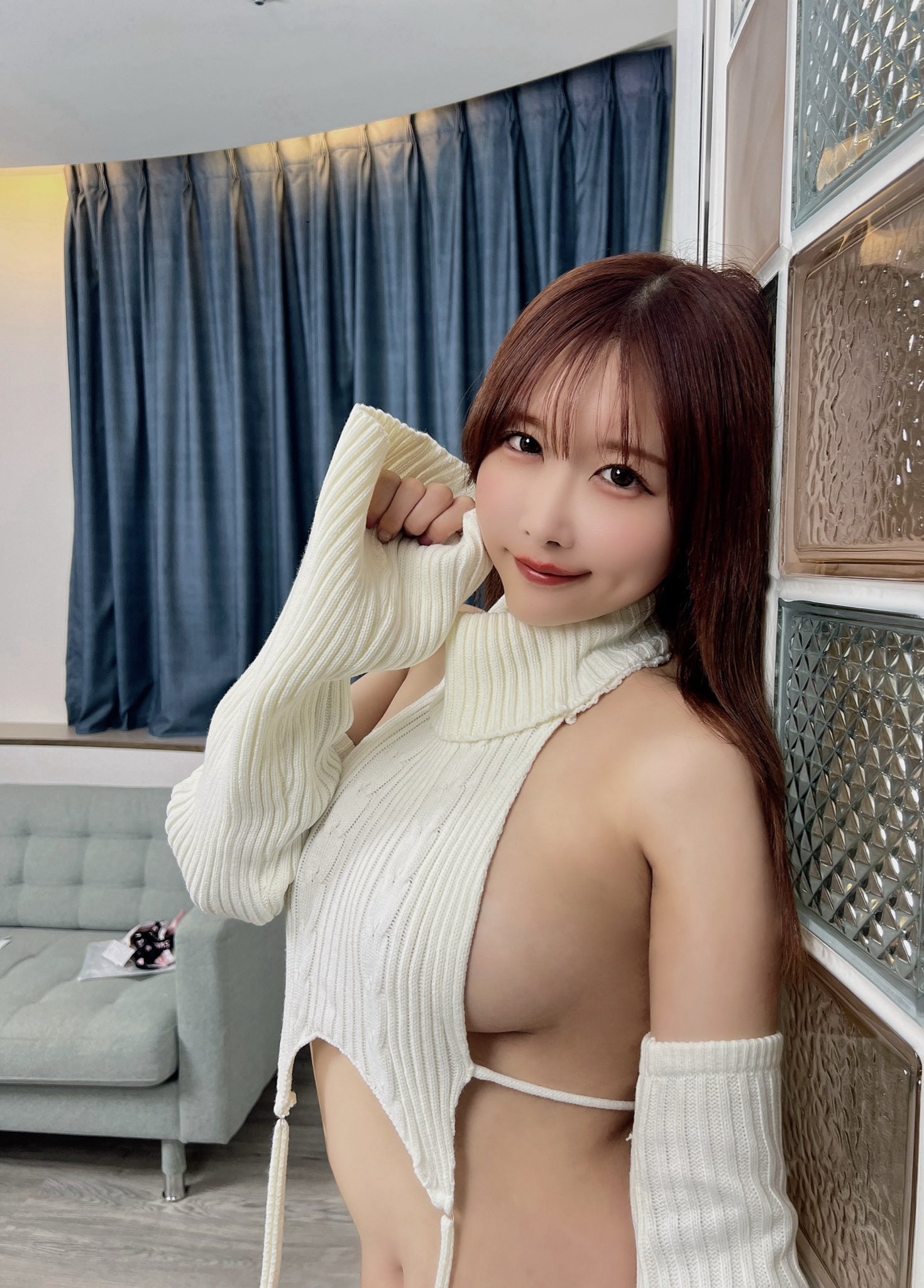 うんぱいさんはXの投稿で「右から見たうんぱいと左から見たうんぱい」とタイトルを添えた、露出度が高すぎて前掛けのようになっているセーター姿を、左右それぞれのアングルで公開。自慢の爆乳が、横から見えてしまっているセクシーな写真を披露している。