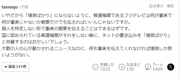 いやだから「憶測ばかり」にならないように、報道機関であるフジテレビは何が事実で何が事実じゃないか概要だけでも伝えればいいんじゃないですか。