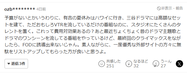 予算がないとかいうわりに、有吉の夏休みはハワイに行き、三谷ドラマには高額なセットを建て、ただおもしろVTRを流しているだけの番組なのに、スタジオにたくさんのタレントを置く。これって費用対効果あるの?