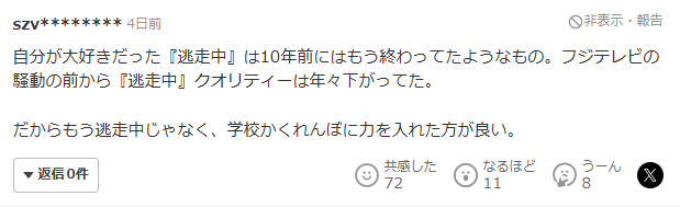 自分が大好きだった『逃走中』は10年前にはもう終わってたようなもの。フジテレビの騒動の前から『逃走中』クオリティーは年々下がってた。だからもう逃走中じゃなく、学校かくれんぼに力を入れた方が良い。