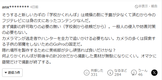 そうすると新しいカギの「学校かくれんぼ」は規模の割に予算が少なくて済むから今のフジテレビには身の丈にあったコンテンツなんだ。