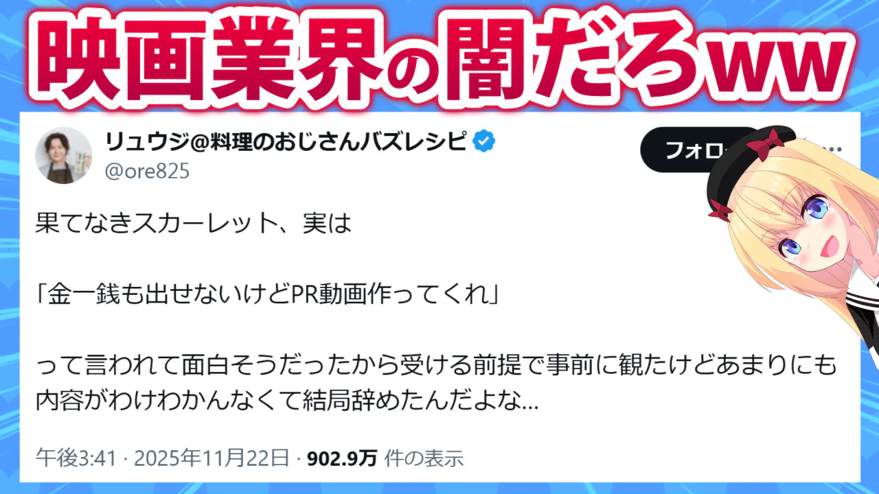 ということで、リュウジさんが覇権映画「果てしなきスカーレット」のPRの闇を暴露するポストをしてしまったことで話題になりました。