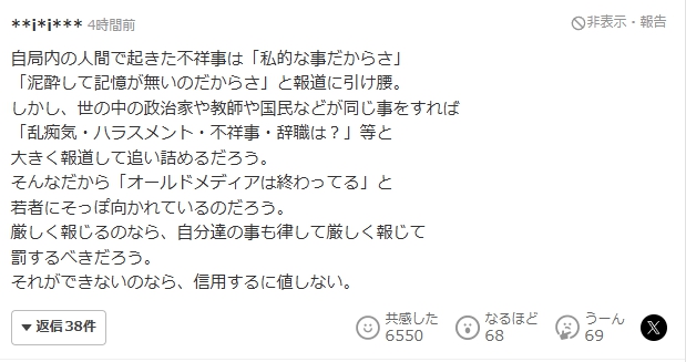 一方、酒席の場で記憶がなくなるほど泥酔し、下着姿で寝ていた点については、報道機関の記者として著しく自覚を欠いたものであり、すでに報道局長より当該記者に対し厳しく注意いたしました。