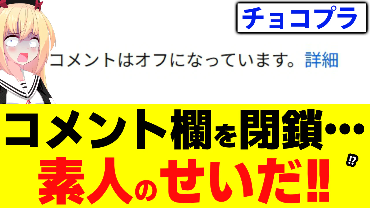 話題になっているのは俺たちのチョコプラ様が、素人ばっかりのプラットフォームであるYouTubeのチャンネルコメント欄を閉鎖しまくっているぞというお話です。