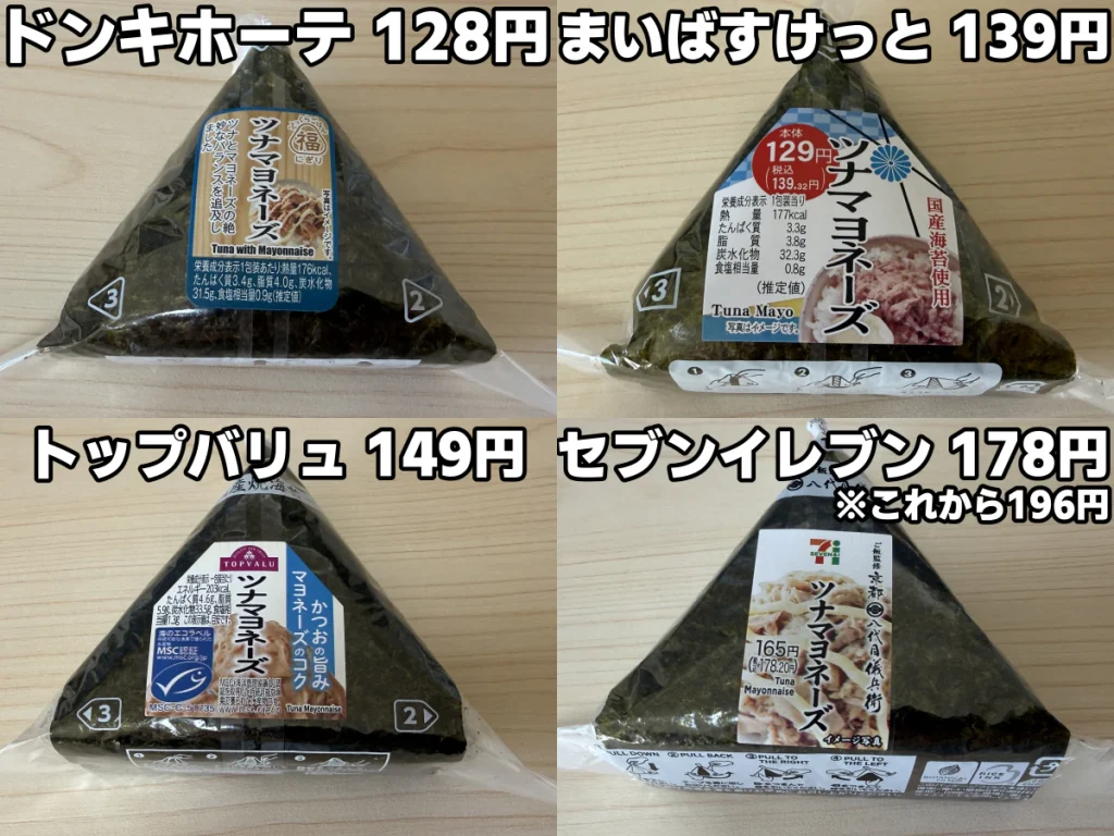 ということで以上、セブン、ドンキ、まいばすけっと、トップバリュのツナマヨおにぎりを実際に購入して食べてみたわけですが、