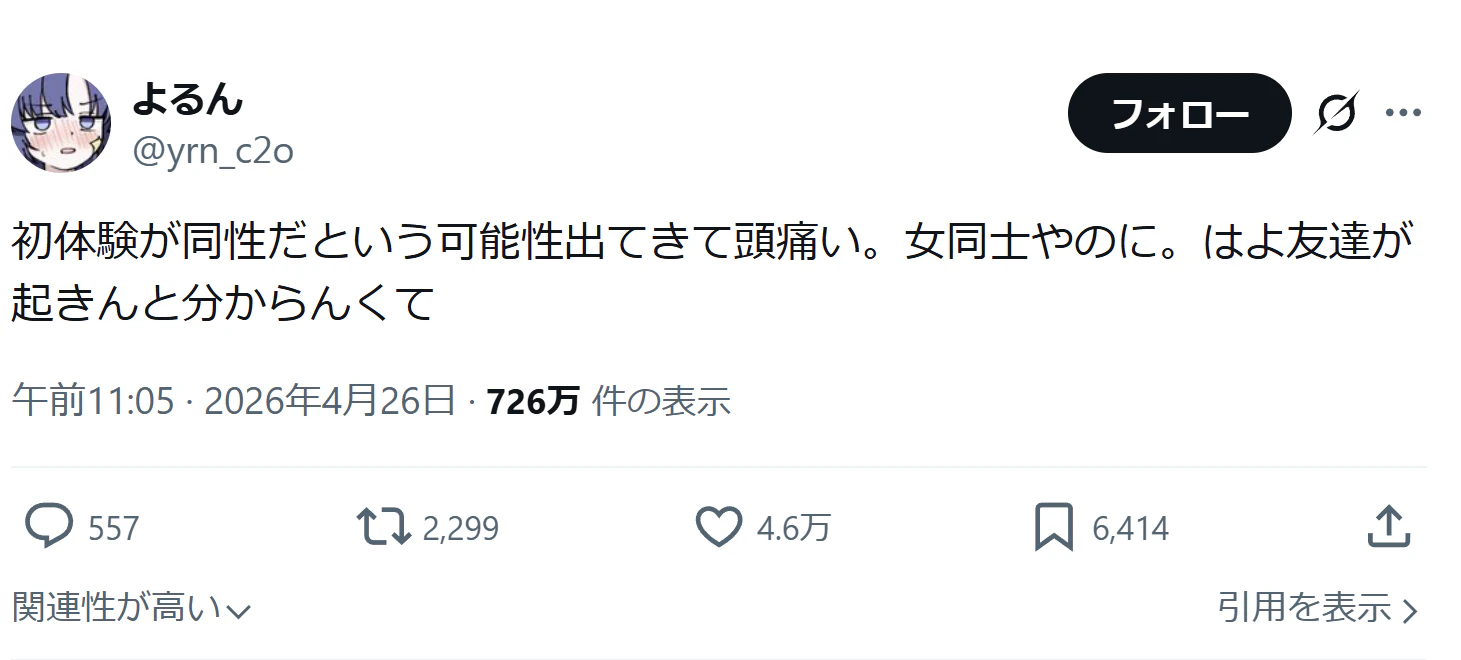 しかも続く投稿で、本人は「初体験が同性だった可能性が出てきた」と困惑。ここでネットの空気が一気に変わった。最初は「大丈夫か」「ちゃんと確認した方がいい」という心配ムードだったのに、「女同士」という一言が入った瞬間、タイムラインが百合展開を察知してざわざわし始めたわけだ。切り替わりが早い。インターネット、こういう時だけ判断が爆速。